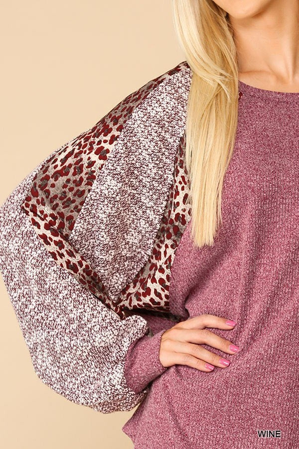 Textured Knit And Animal Print Mixed Dolman Sleeve Top