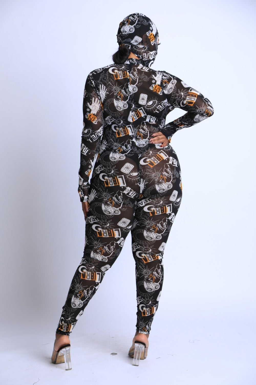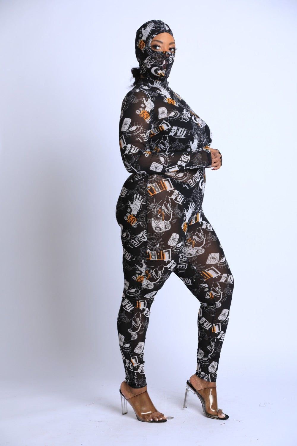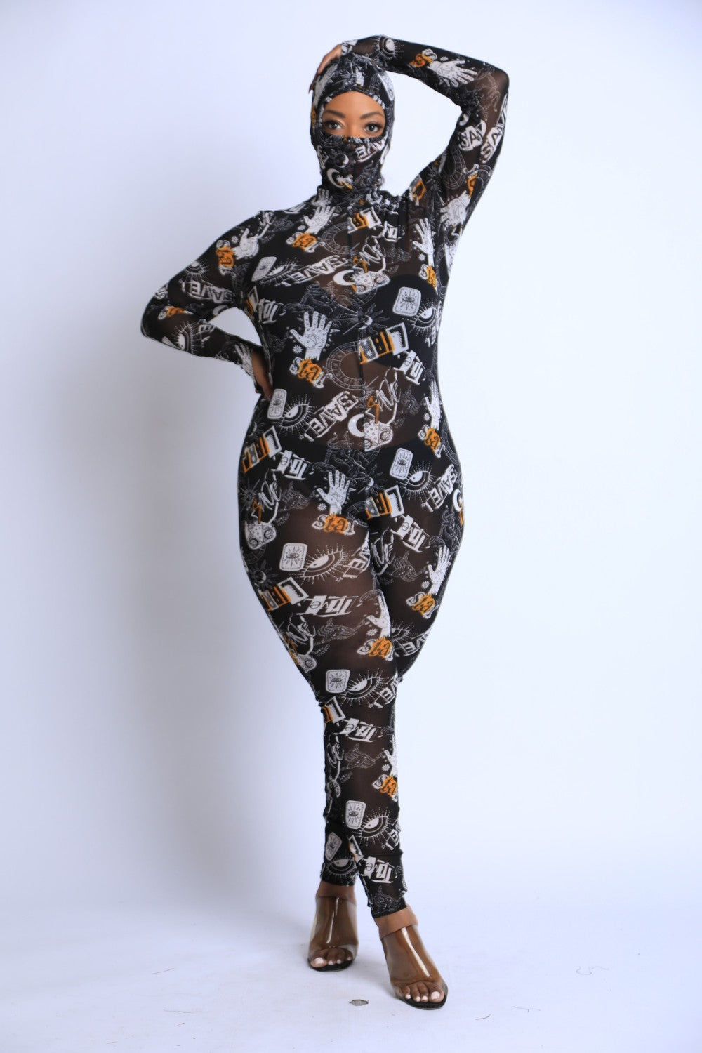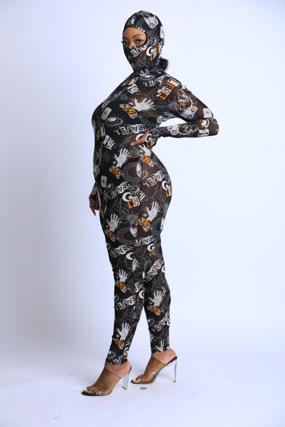 Printed Mesh Jumpsuit With Headpiece