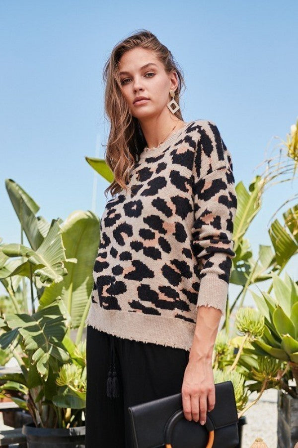 Round Neck Long Sleeve Frayed Edge Leopard Print Sweater