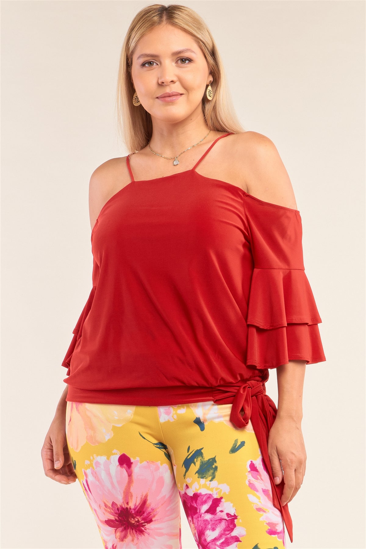 Plus Size Red Sleeveless Off-the-shoulder Layered Angel Sleeve Self-tie Hem Top