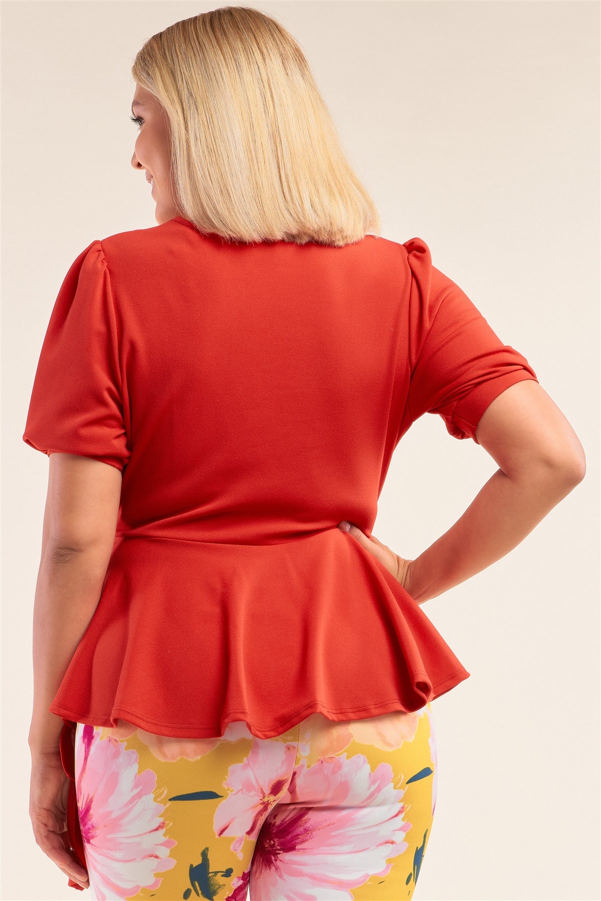 Plus Size Pink V-neck Mini Puff Sleeve Pleated Wrap Self-tie Waist Flared Hem Top