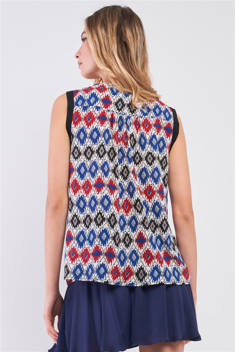 Red, blue, white, geometric print, black contrast detail, sleeveless, round neckline, loose fit, unlined, non-sheer, non-stretch, casual, comfy, spring/summer collection, American flag colors????
